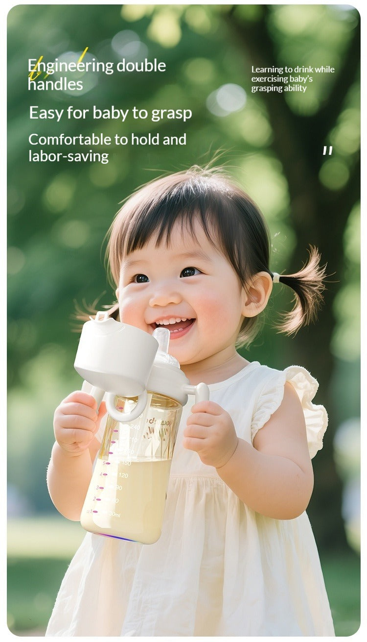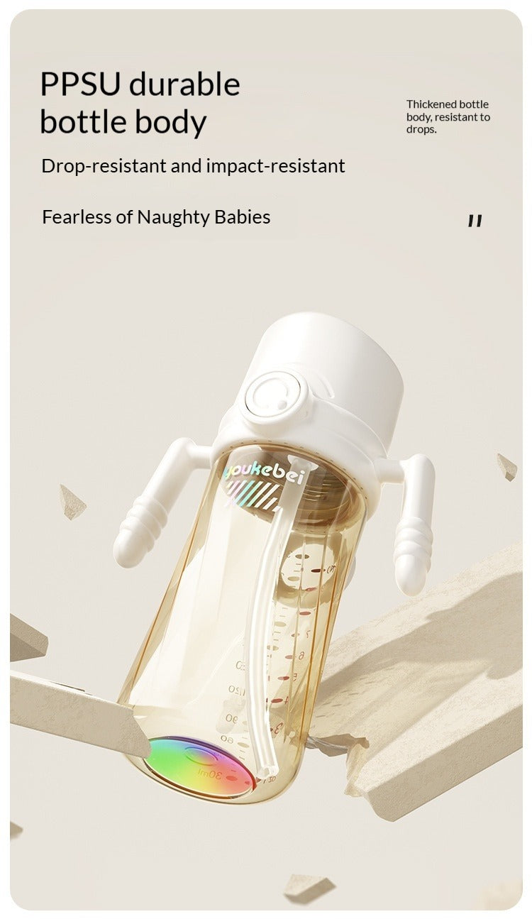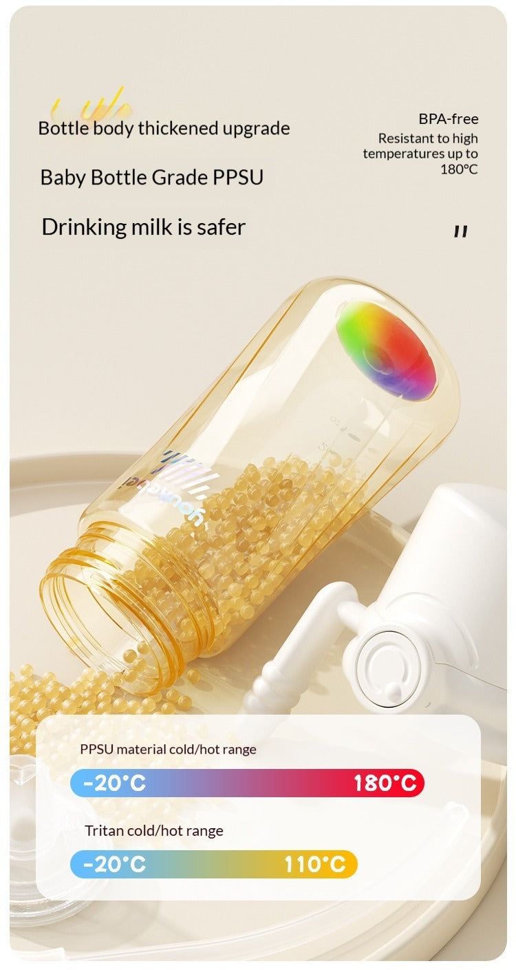 Thickened PPSU bottle body, BPA-free, heat-resistant up to 180°C and cold-resistant down to −20°C. More durable and impact-resistant than Tritan for long-term use.