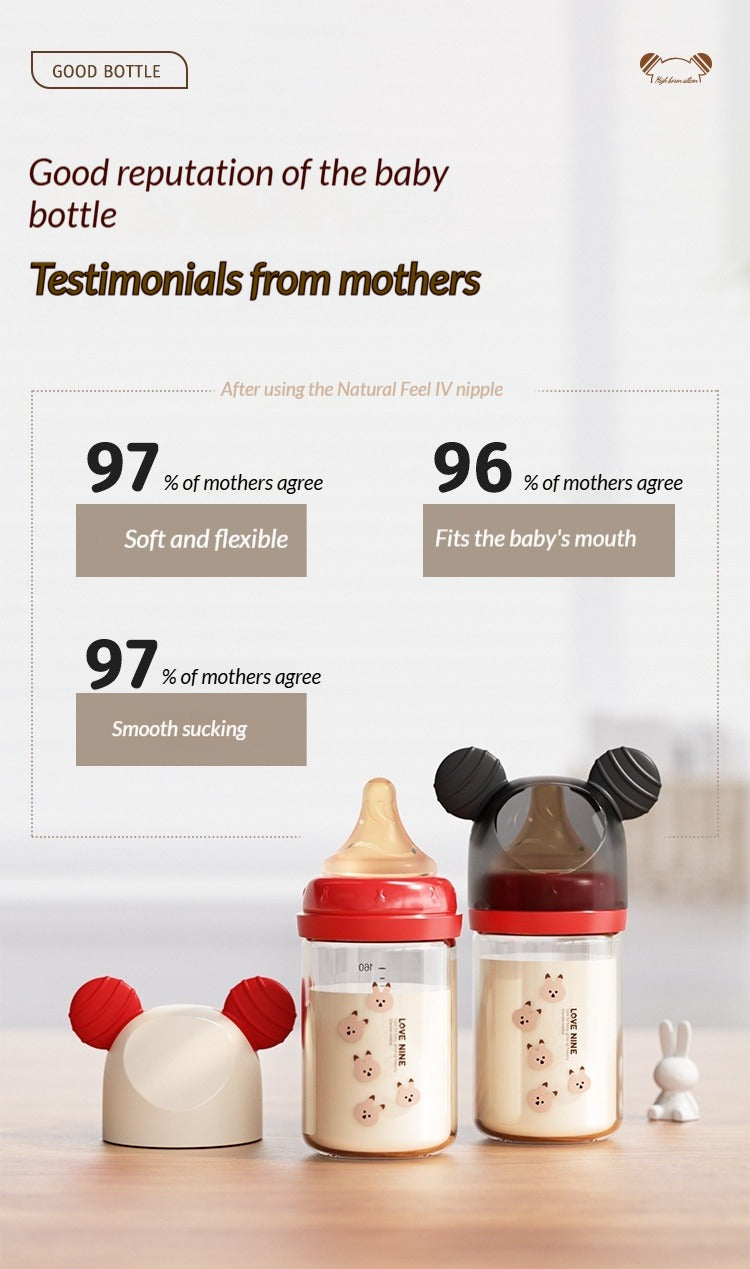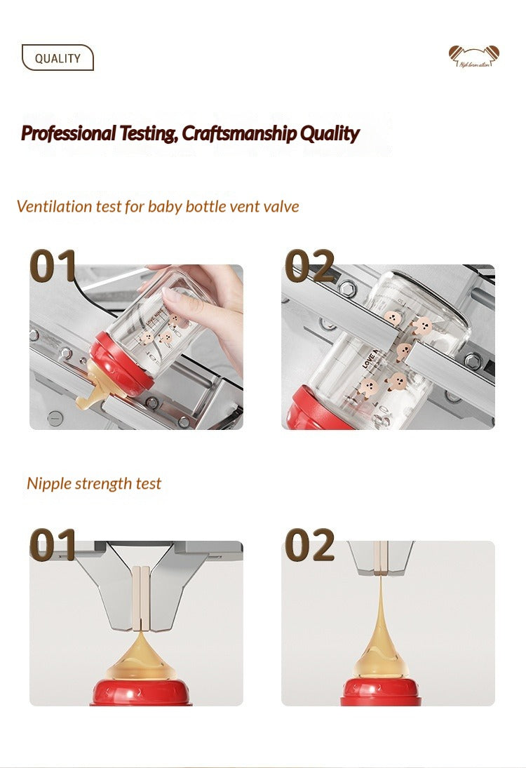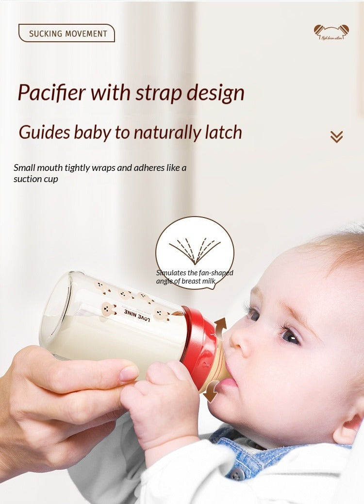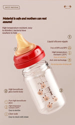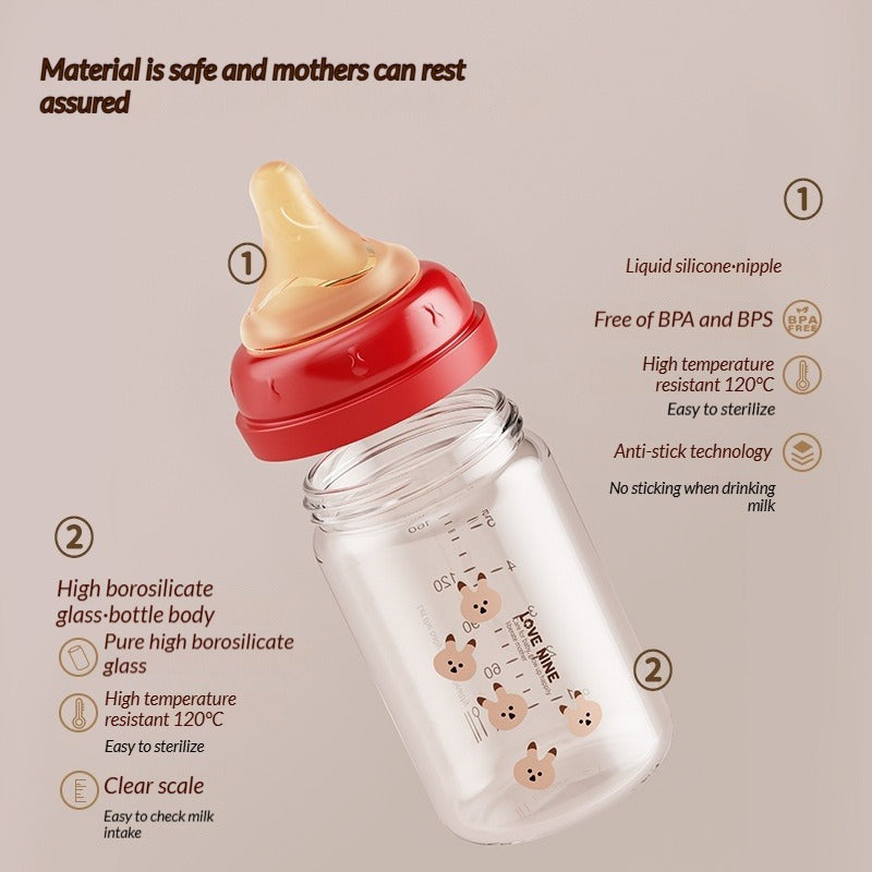 Safety is fully assured: the nipple is BPA- and BPS-free, heat-resistant up to 120°C, and suitable for multiple sterilization methods. The bottle body is crafted from premium borosilicate glass, offering excellent heat resistance, durability, and clear measurement markings for easy monitoring of milk intake.