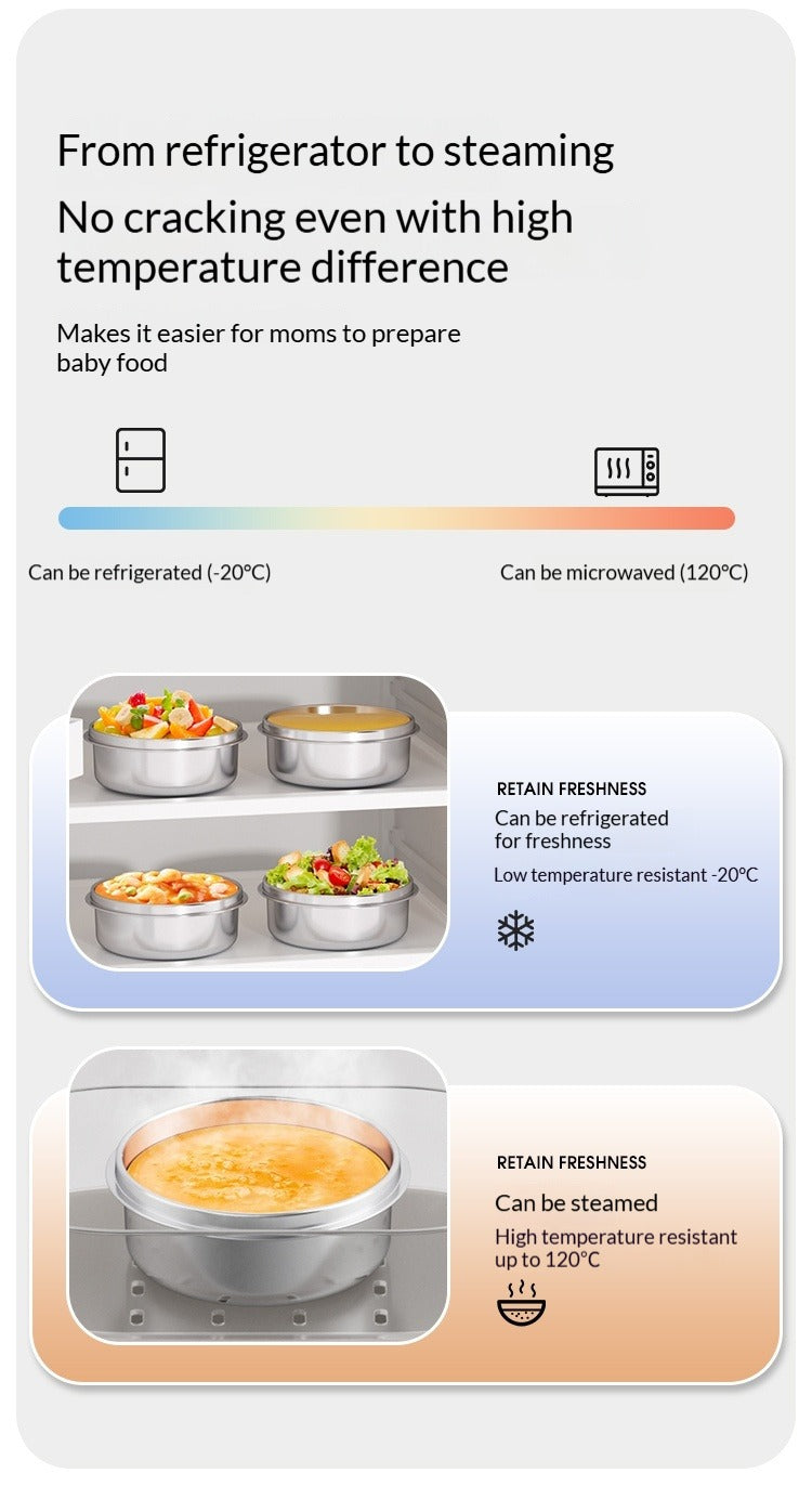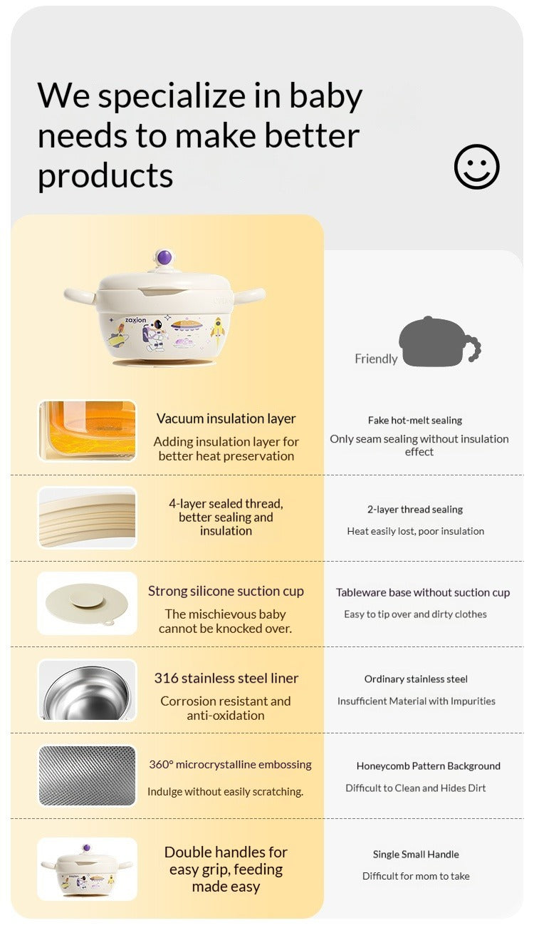 Add 60°C hot water to keep food warm, or 7°C cold water to cool it down quickly. Suitable for all seasons and gentle on baby’s stomach.