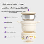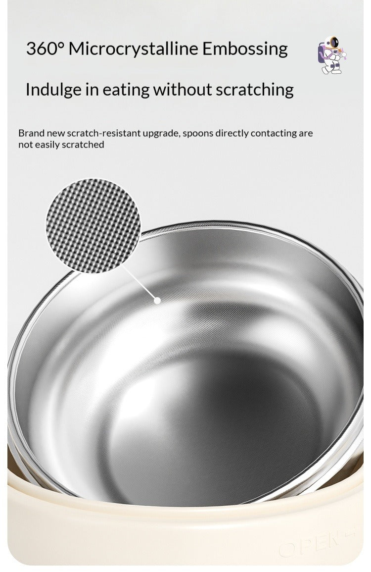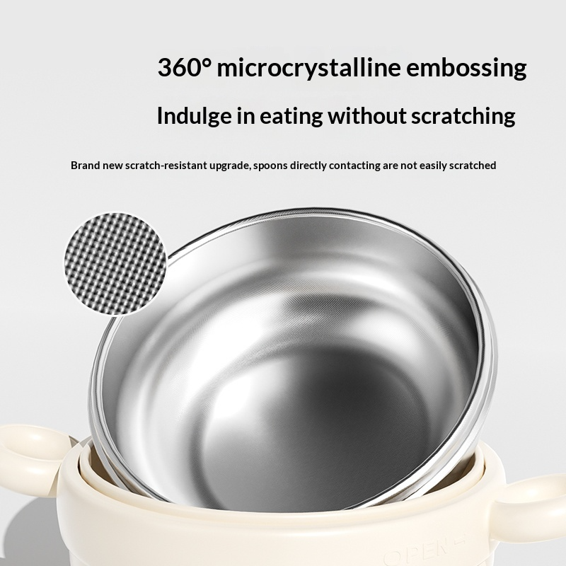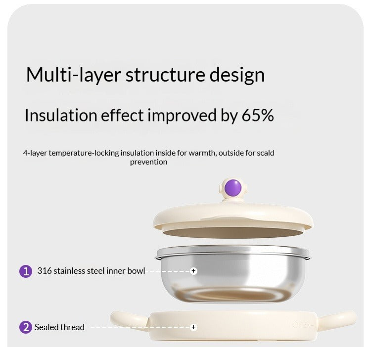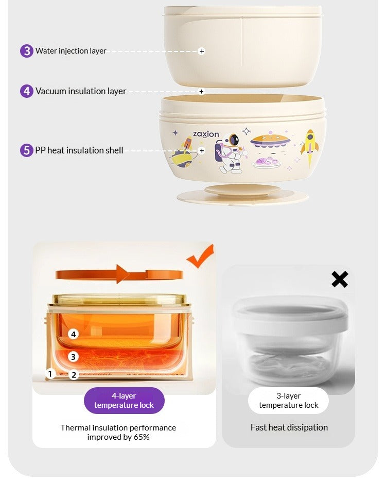 Multi-layer heat-lock design with a stainless steel inner bowl, sealed threading, water-injection layer, vacuum insulation, and PP outer shell—keeping food warm longer while staying cool to the touch.