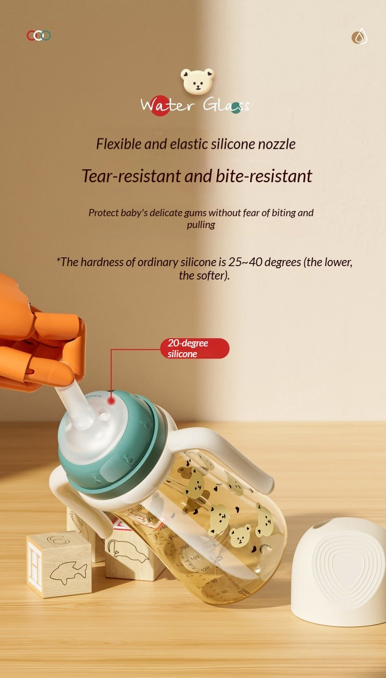 Made with food-grade, BPA-free materials. The durable, drop-resistant bottle is paired with 20-degree ultra-soft silicone spouts**—gentle on gums, safe for chewing.