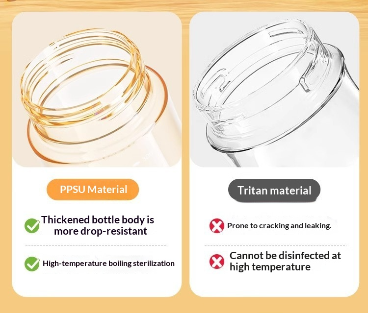 Reinforced PPSU Bottle Body: Impact-resistant and suitable for high-temperature boiling sterilization, offering higher durability than Tritan.