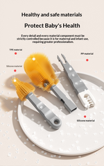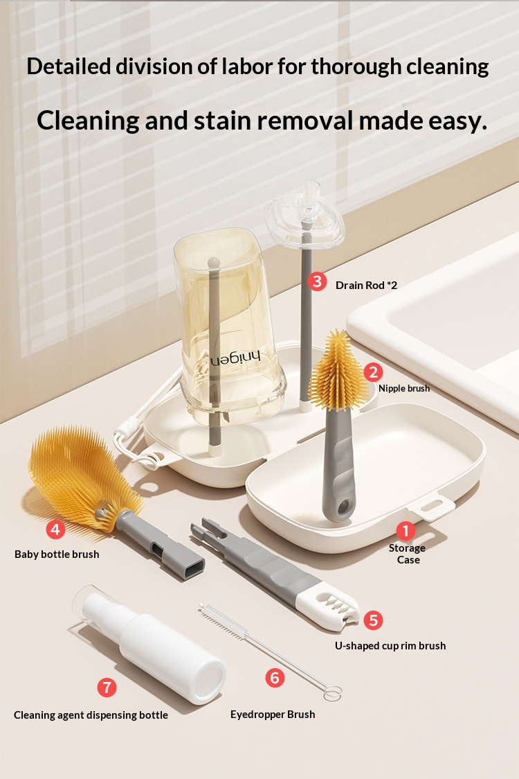 แปรงล้างขวดนมแบบสองด้านเข้าถึงก้นขวดทุกรูปทรง แปรงจุกนมซิลิโคนเหลวเข้าถึงรายละเอียดได้อย่างแม่นยำ แปรงขอบขวดรูปตัว U ขจัดคราบฝังแน่น แปรงหลอดไนลอนความหนาแน่นสูงเคลือบสารป้องกันรอยขีดข่วนทำความสะอาดทุกซอกทุกมุม