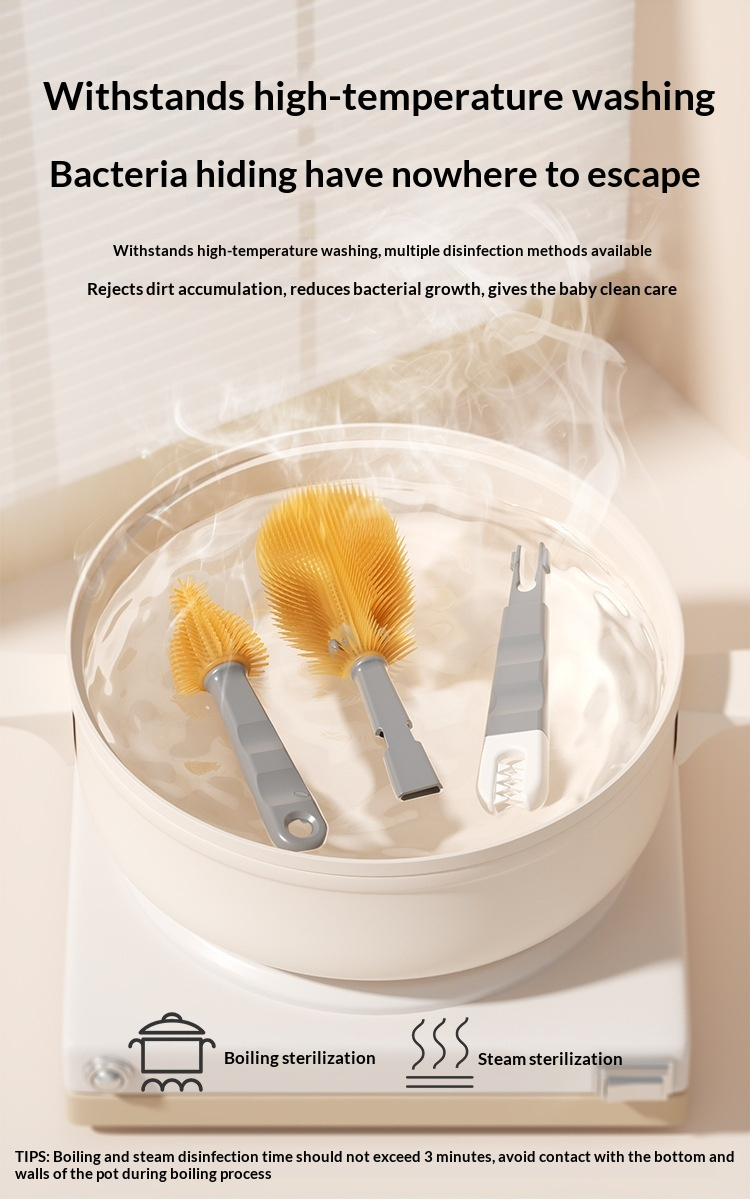 ขนแปรงนุ่มแต่หนาแน่น ทนทานต่อการหลุดร่วงและแตกหัก ผลิตจาก ABS, TPE และซิลิโคนเกรดอาหาร สามารถฆ่าเชื้อด้วยไอน้ำหรือน้ำเดือดได้ (ไม่เกิน 3 นาที)