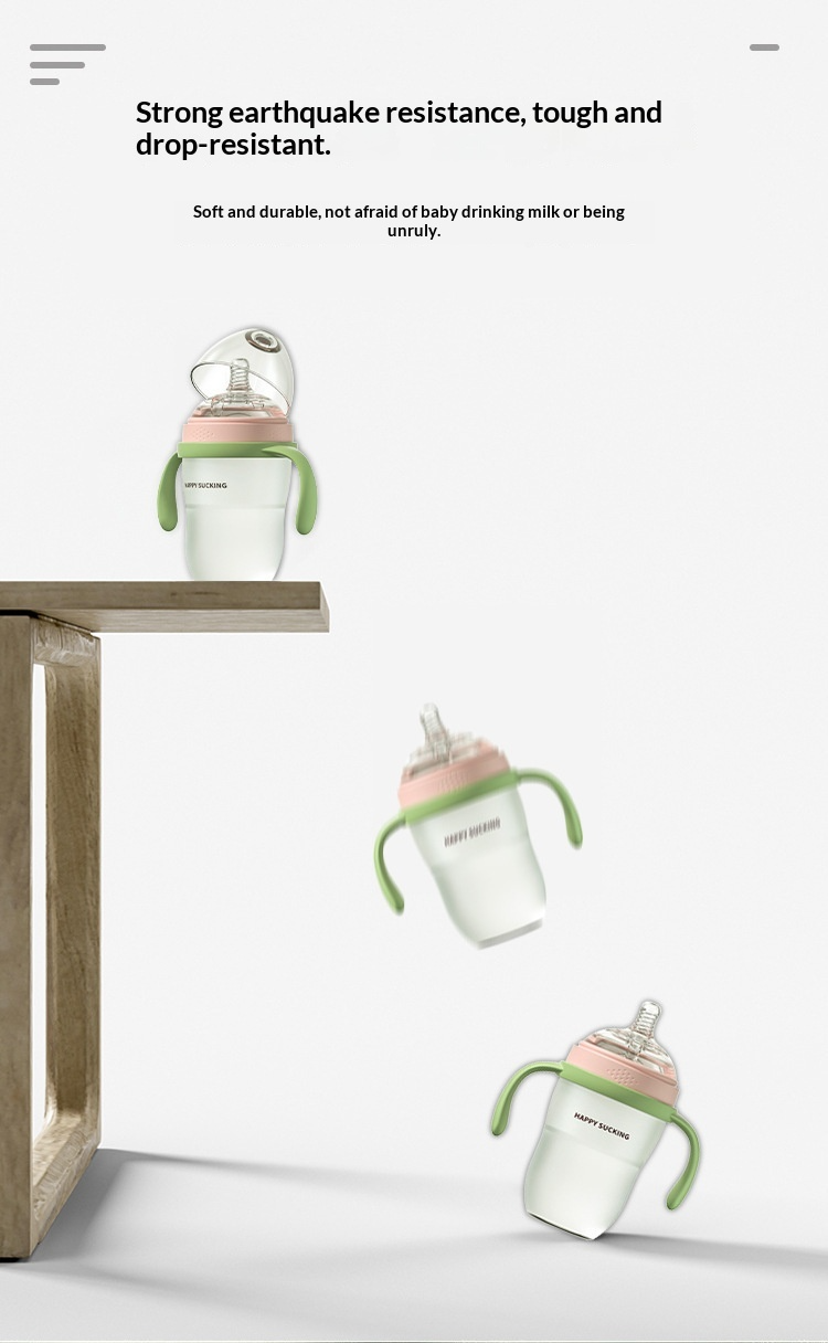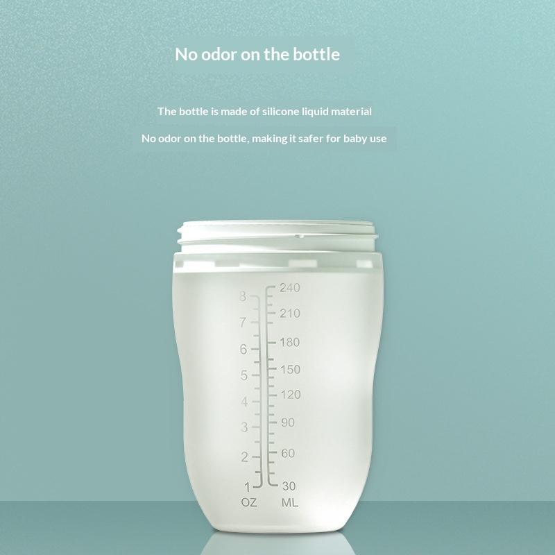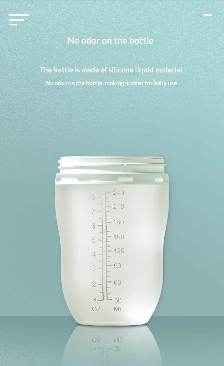 ผลิตจาก ซิลิโคนเหลวเกรดอาหาร ทั้งส่วนจุกนมและตัวขวด ไม่มีกลิ่น ไม่มีสีย้อม และปราศจาก BPA จึงมั่นใจได้ถึงความปลอดภัยและความอ่อนโยนในการป้อนนม