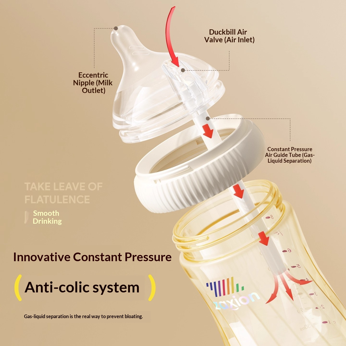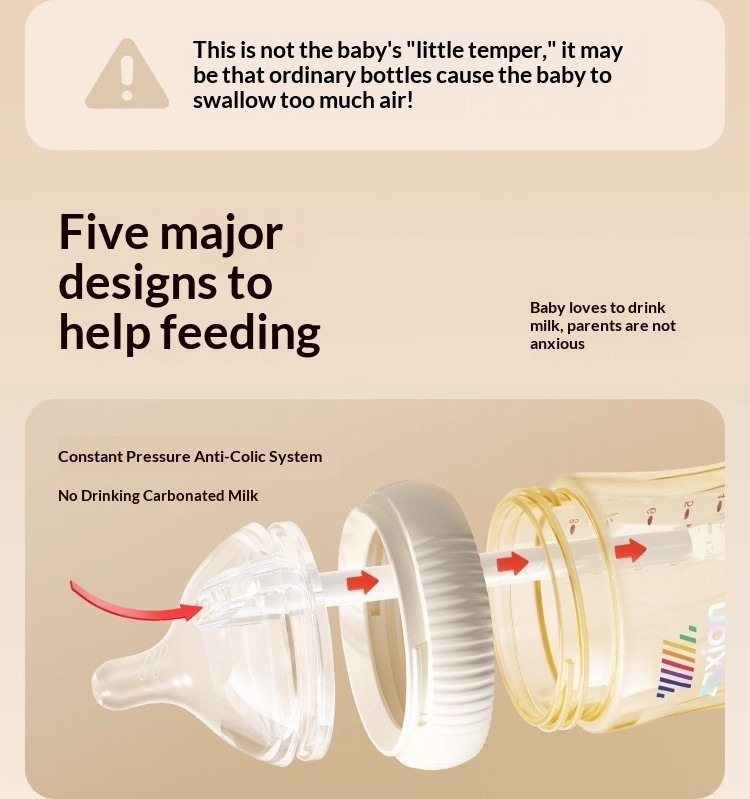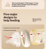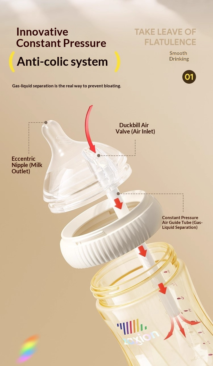 ระบบแรงดันคงที่ป้องกันอาการจุกเสียดอย่างแท้จริง – อากาศและนมถูกแยกออกจากกันอย่างสมบูรณ์ อากาศจะไหลลงสู่ก้นขวดโดยตรงเพื่อลดแก๊ส การสำรอก และอาการงอแง