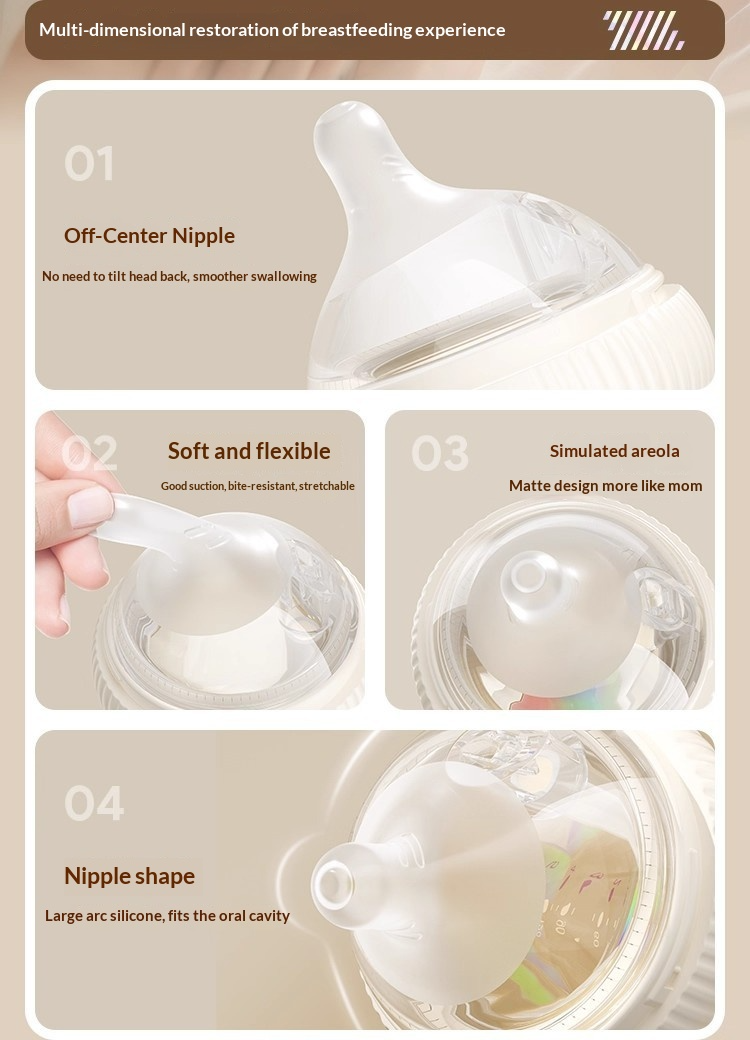 ประสบการณ์การให้นมที่เหมือนเต้านม จริง – จุกนมซิลิโคนเหลวที่อยู่ตรงกลาง เนื้อนุ่ม ยืดหยุ่นได้ และมีน้ำนมไหลออกมาอย่างช้าๆ เป็นรูปทรงหยดน้ำ ช่วยให้ดูดง่าย