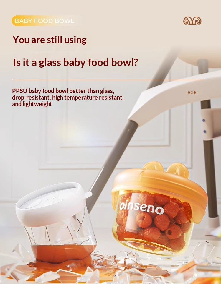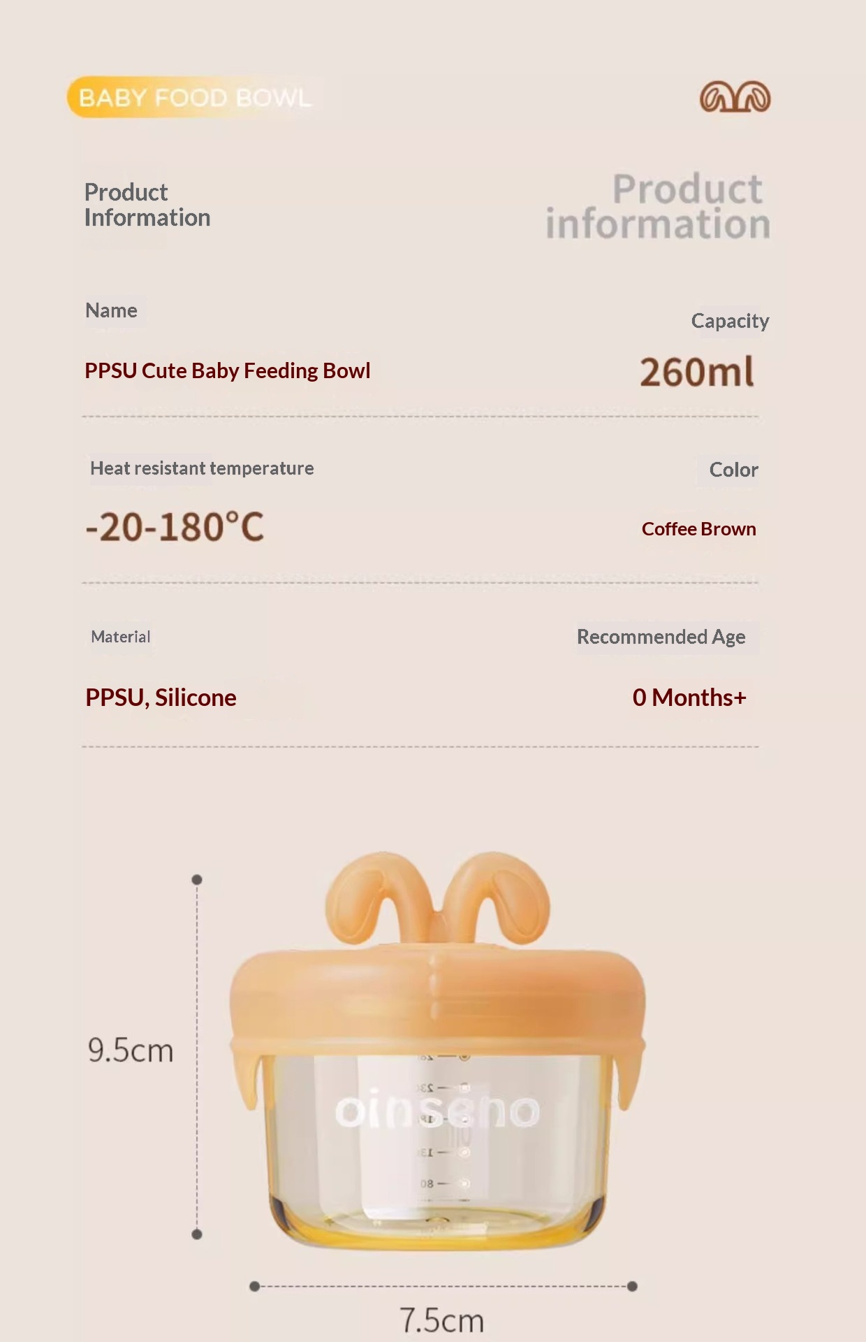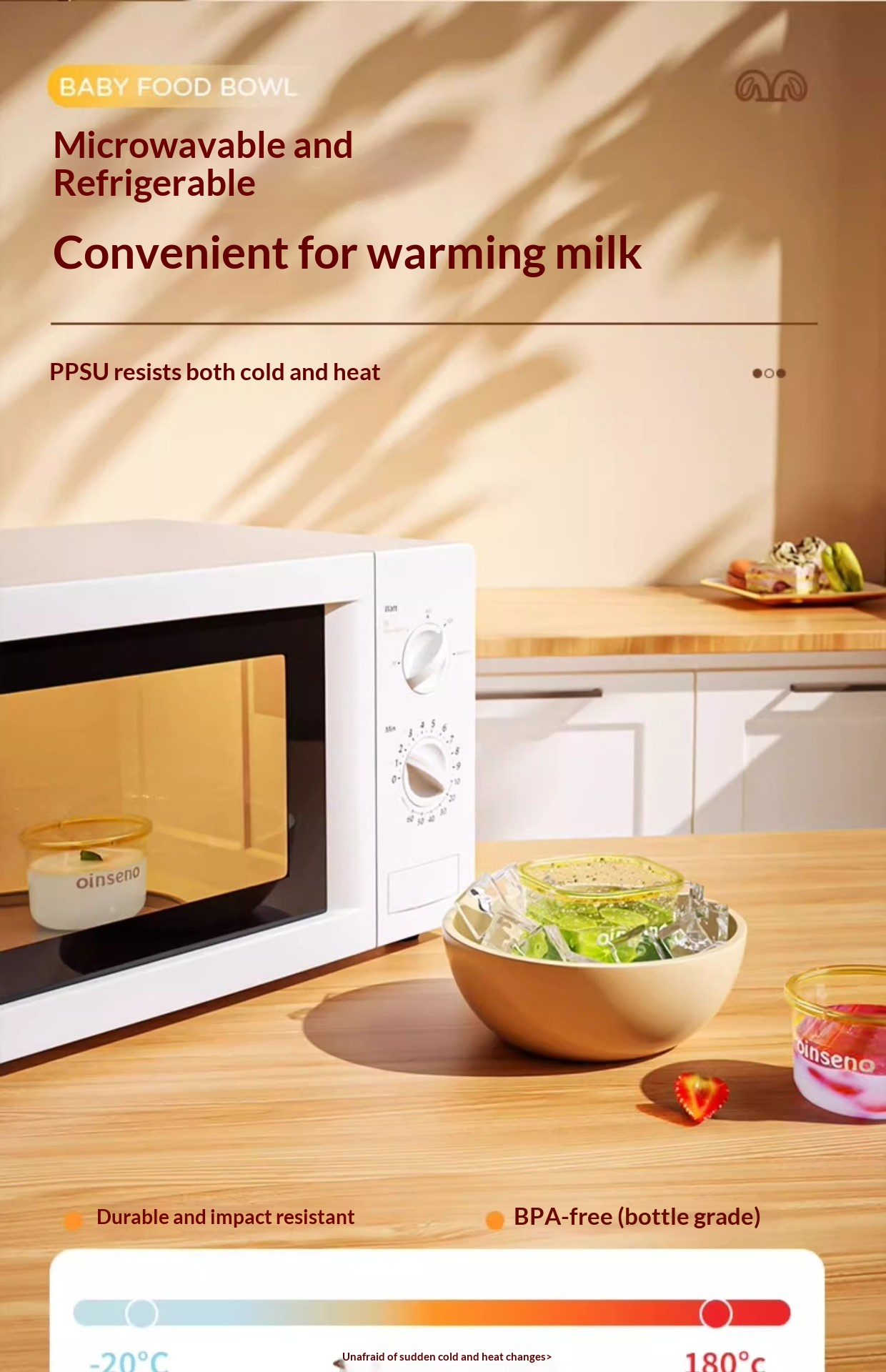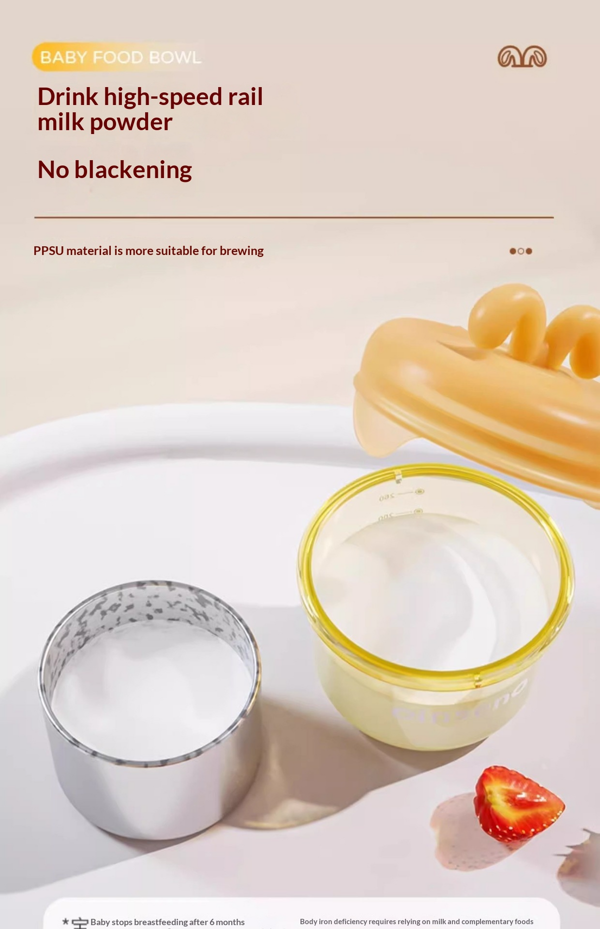 PPSU bowl body withstands -20°C to 180°C, safe for microwaving, refrigeration, and repeated sterilization. Lightweight yet impact-resistant, it won’t react with food or discolor high-iron formula or cereal.