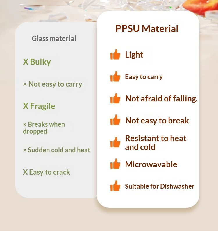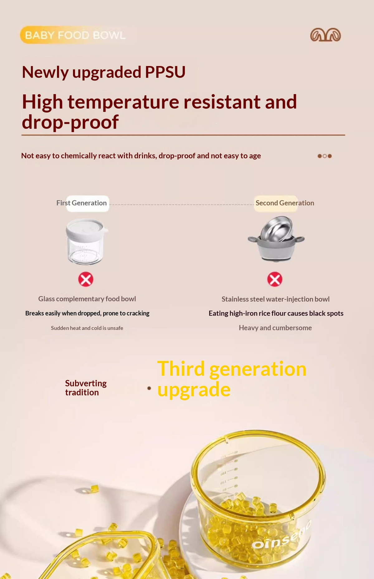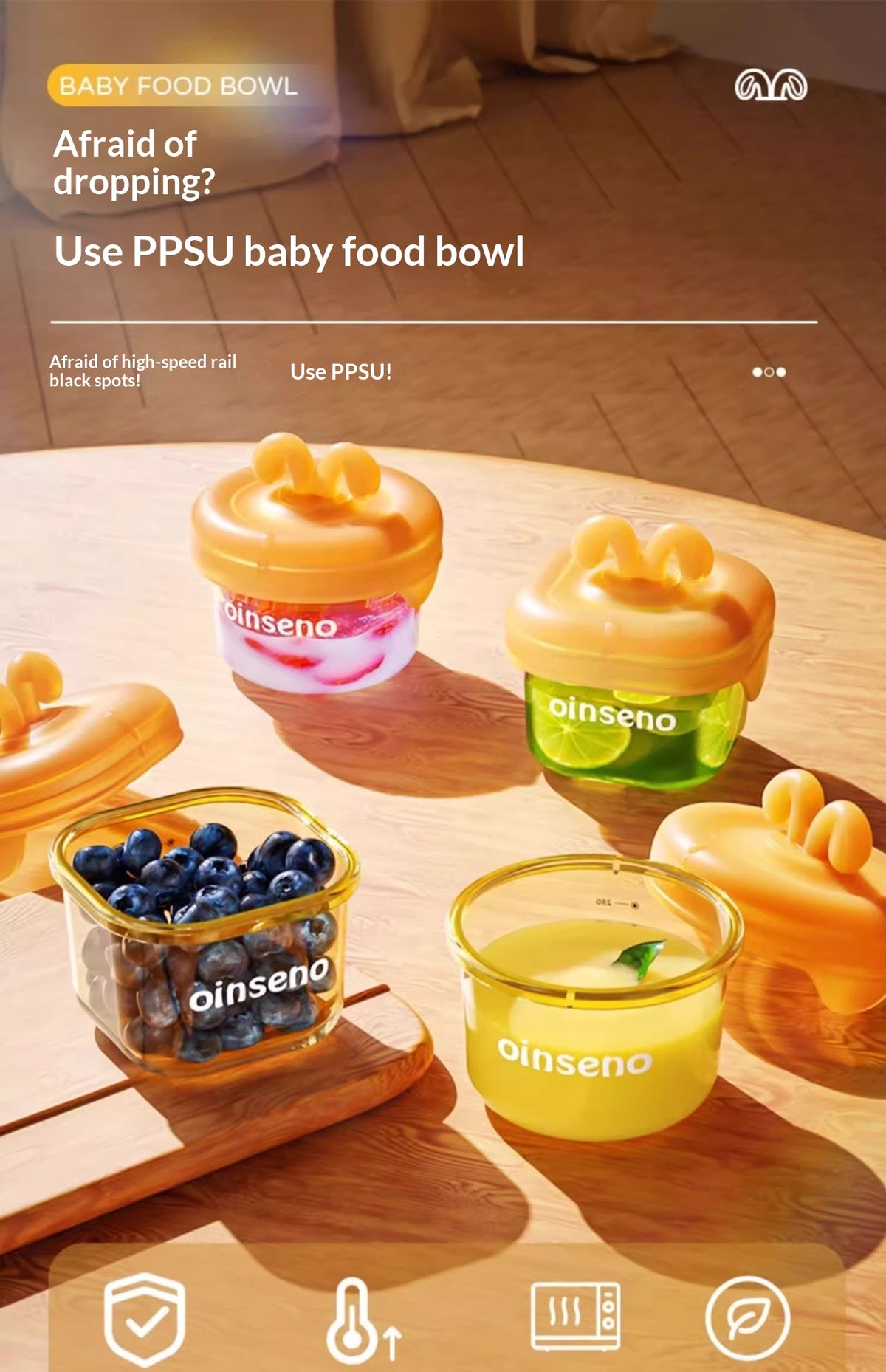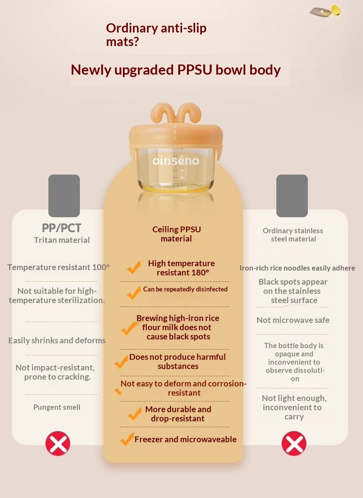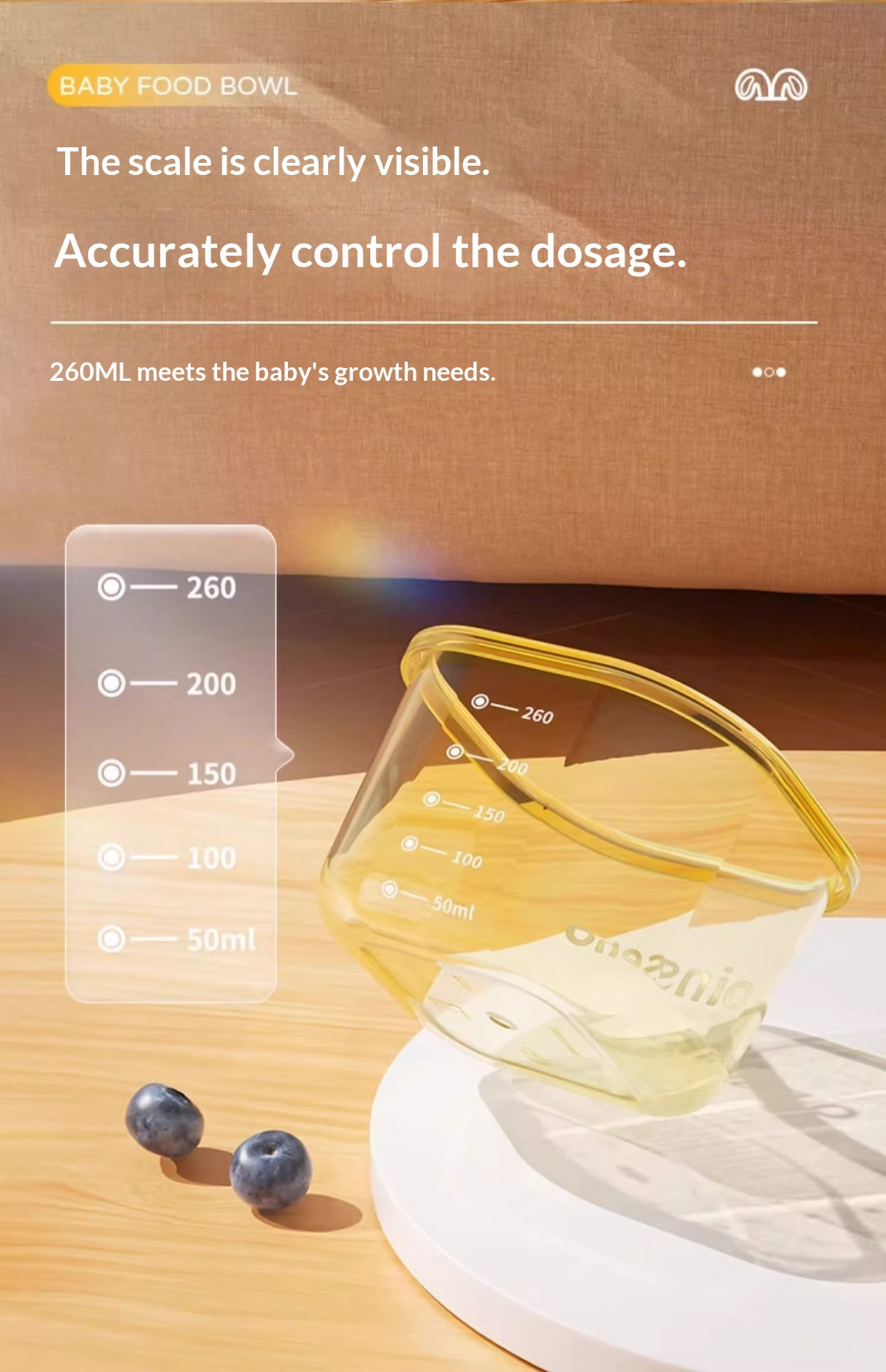 PPSU bowl body withstands -20°C to 180°C, safe for microwaving, refrigeration, and repeated sterilization. Lightweight yet impact-resistant, it won’t react with food or discolor high-iron formula or cereal.